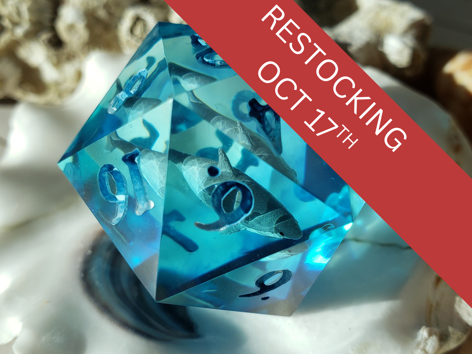 A single handmade, sharp-edged jumbo d20 with a happy little shark swimming around in it. The numbers are painted in a blue to white gradient.