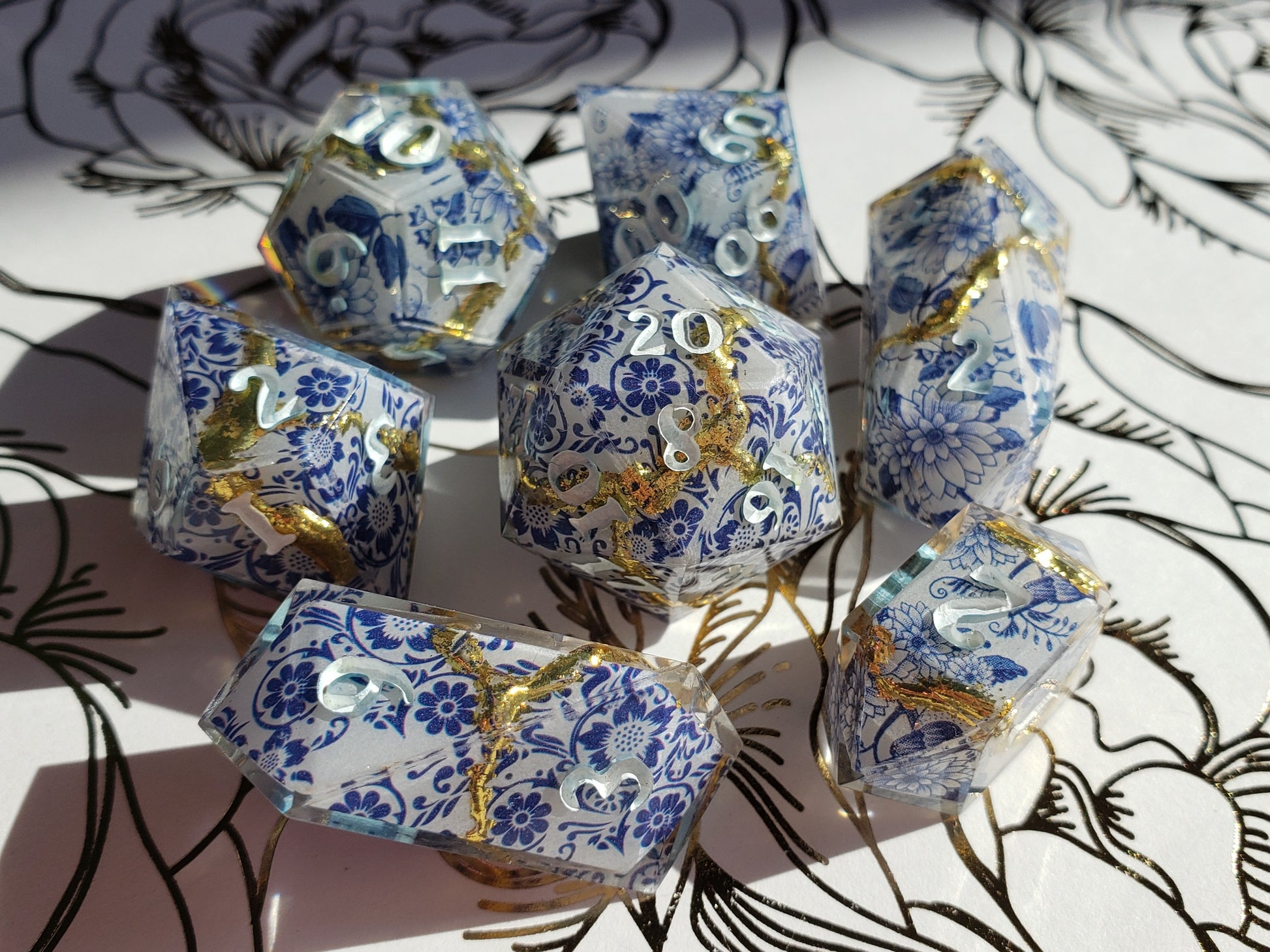 Handmade, sharp-edged resin dice inspired by the Japanese art of kintsugi - repairing broken pottery with gold.