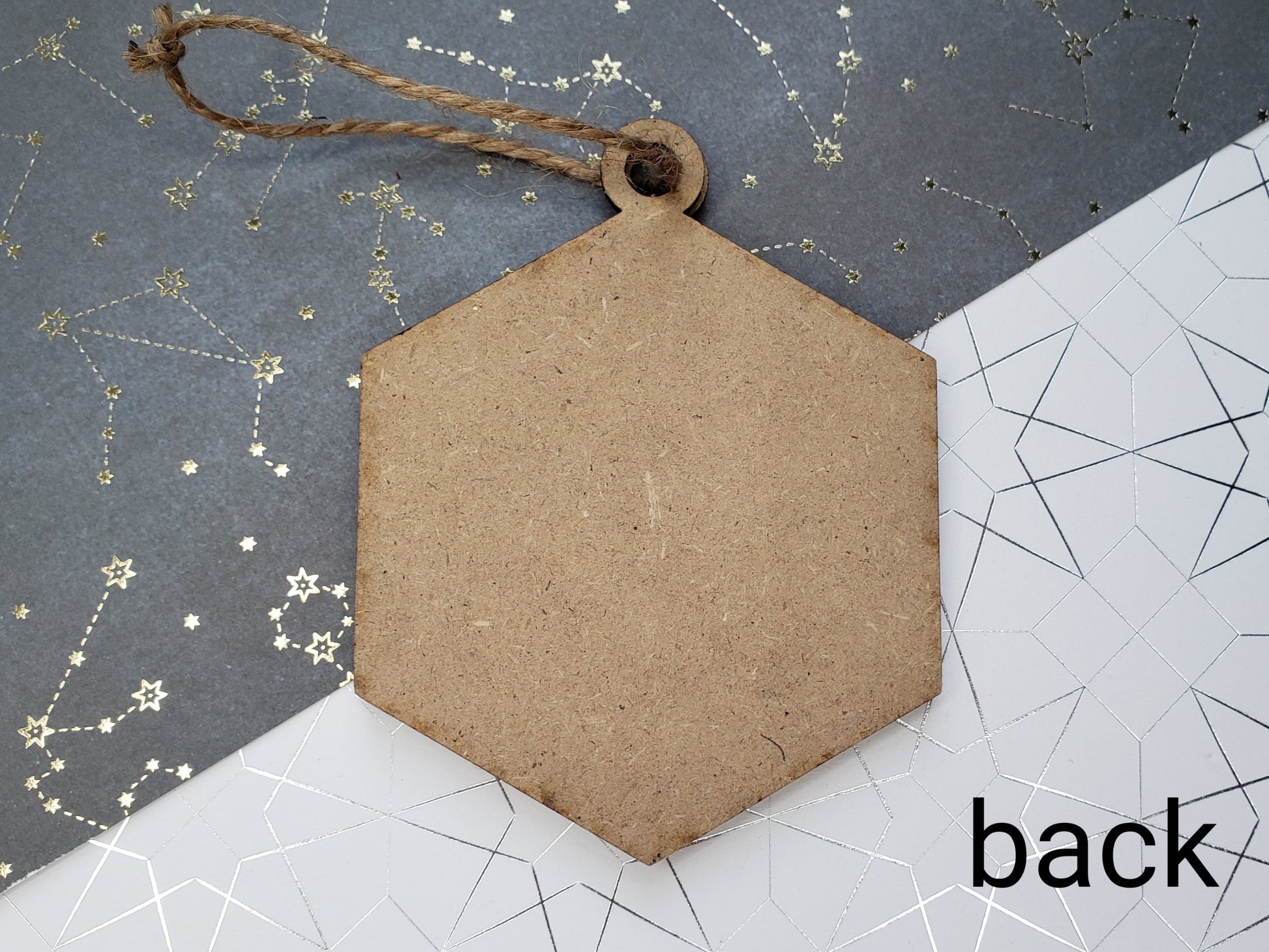 The ornaments are laser cut from MDF (wood fiberboard) with a walnut or maple wood veneer, and hand-painted. They measure approximately 8 cm (~3 inches) across. The string hangers are jute twine and the backside is plain fibreboard (see last photo).
