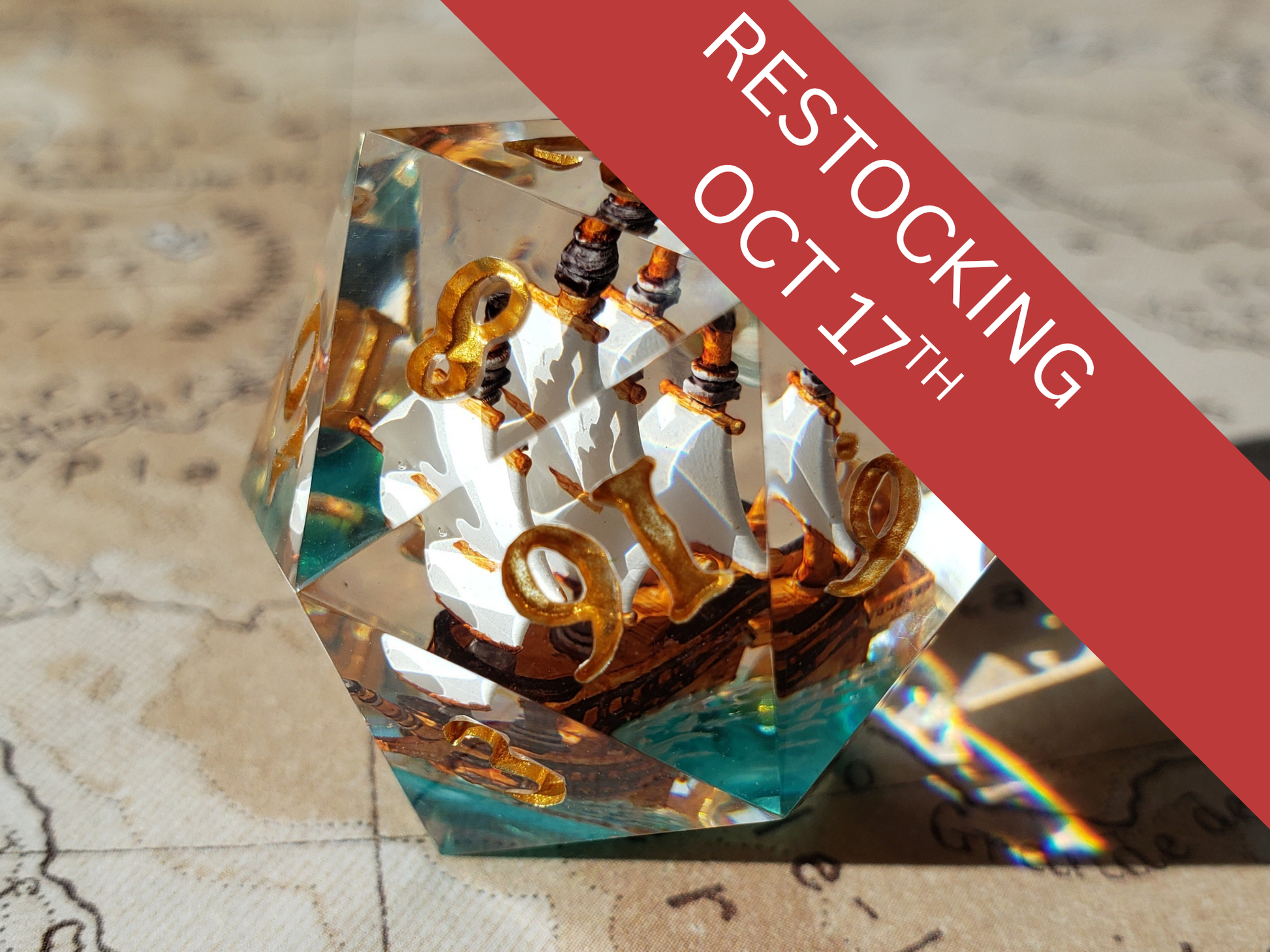 A single handmade, sharp-edged jumbo 30 mm D20 featuring a hand-painted insert of a ship under sail.