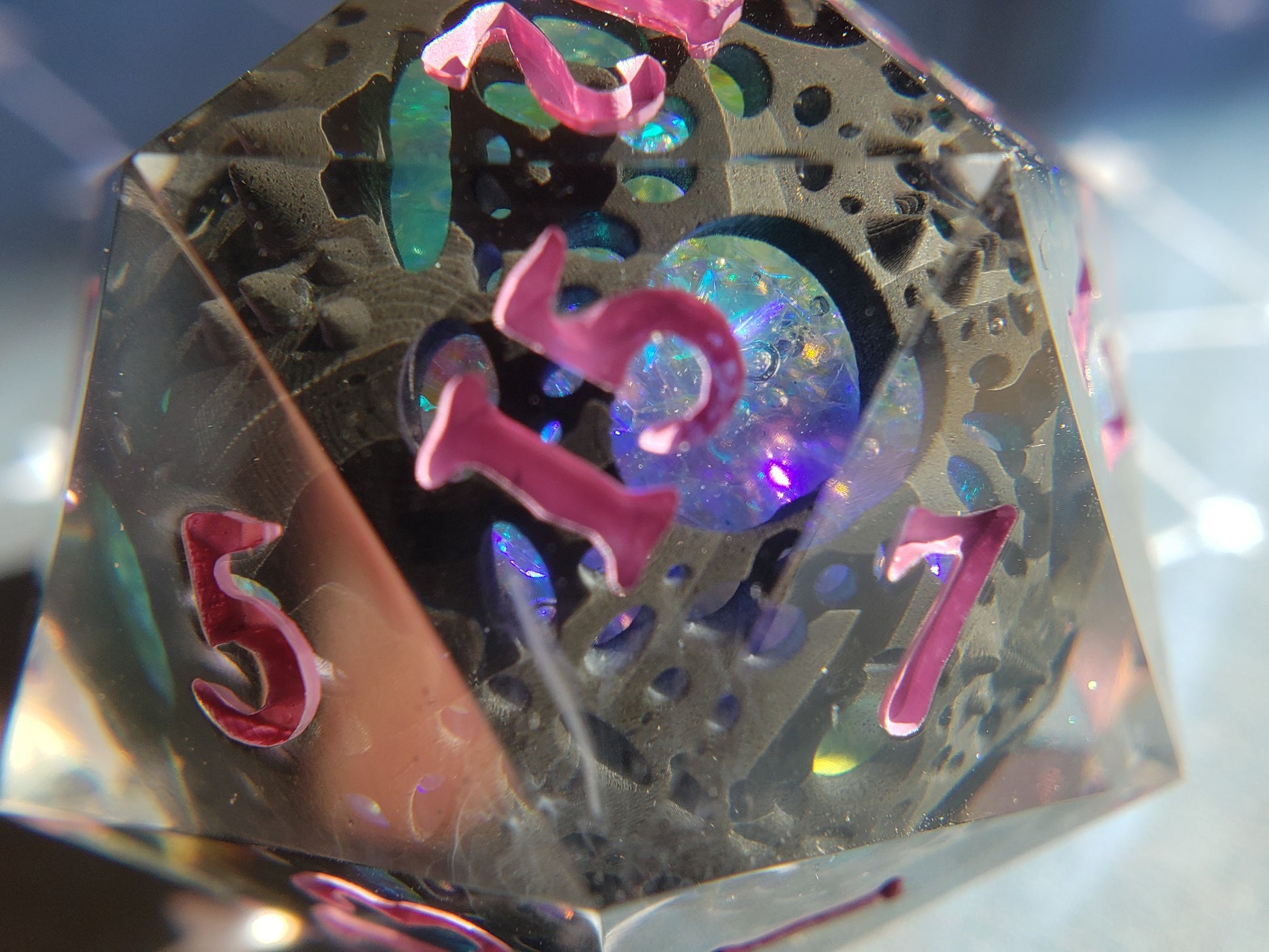 A single handmade, sharp-edged jumbo d20 containing a corrupted hexcore anomaly. This is an experimental version with some cosmetic issues (small particles caught in the resin), and is slightly discounted compared to the final design which will come at a late date.