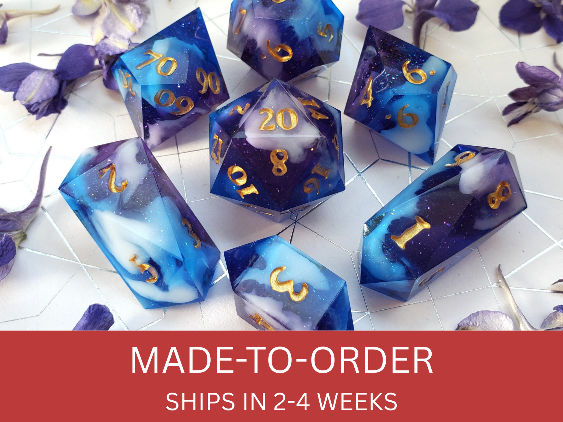 7-piece set of handmade, sharp-edged dice that may or may not contain the soul of a dead god. Galaxies of blue and purple with shimmering stars and white nebulas.