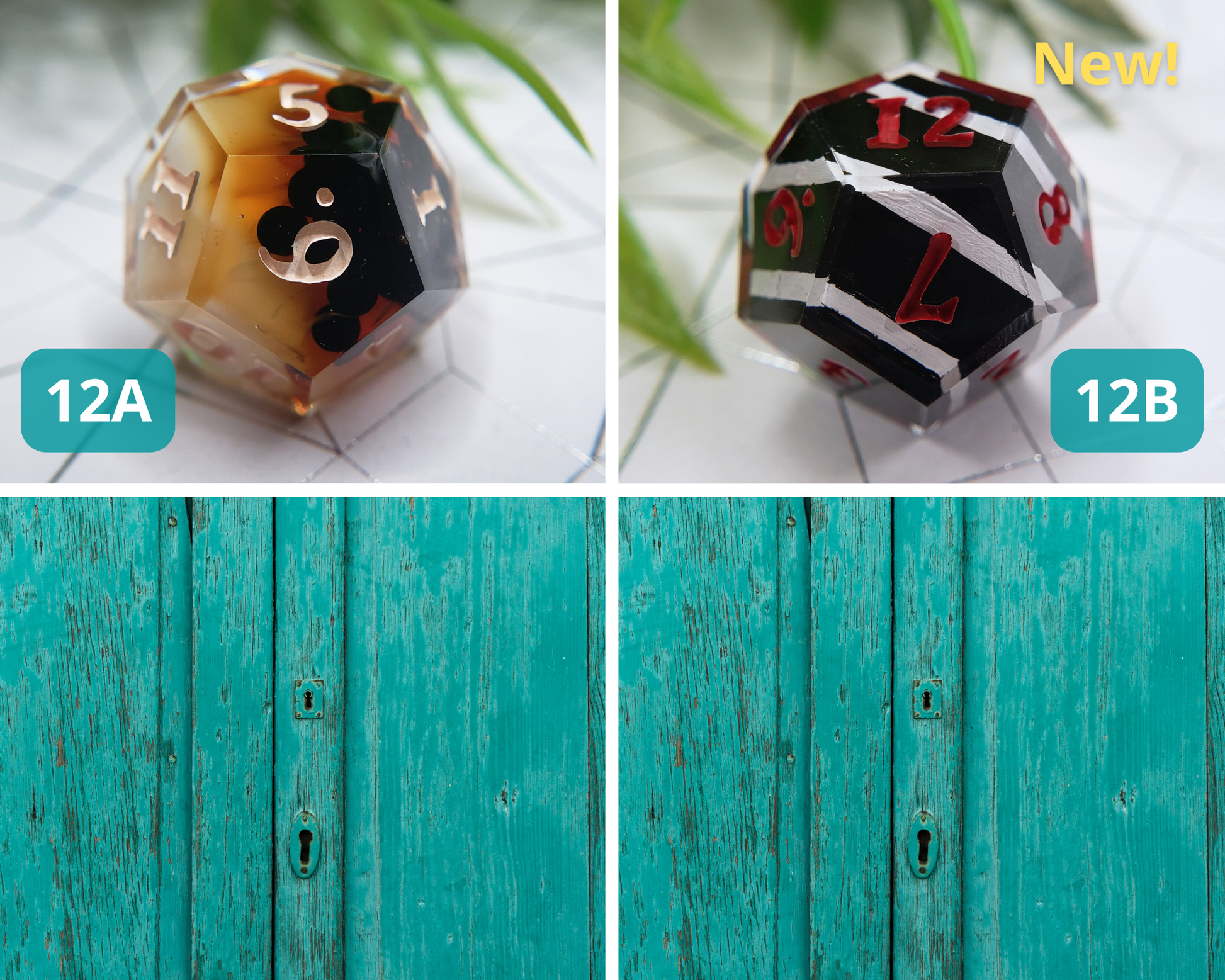 All of my dice are molded, poured, polished, and inked by hand. The dice are made of durable epoxy resin, which can handle your rolls with ease. Due to the handmade nature of the dice, every set is unique and there may be minor faults or flaws such as small bubbles, scratches, or mold marks - however, my general rule of thumb is that these should only be noticeable with close inspection.
