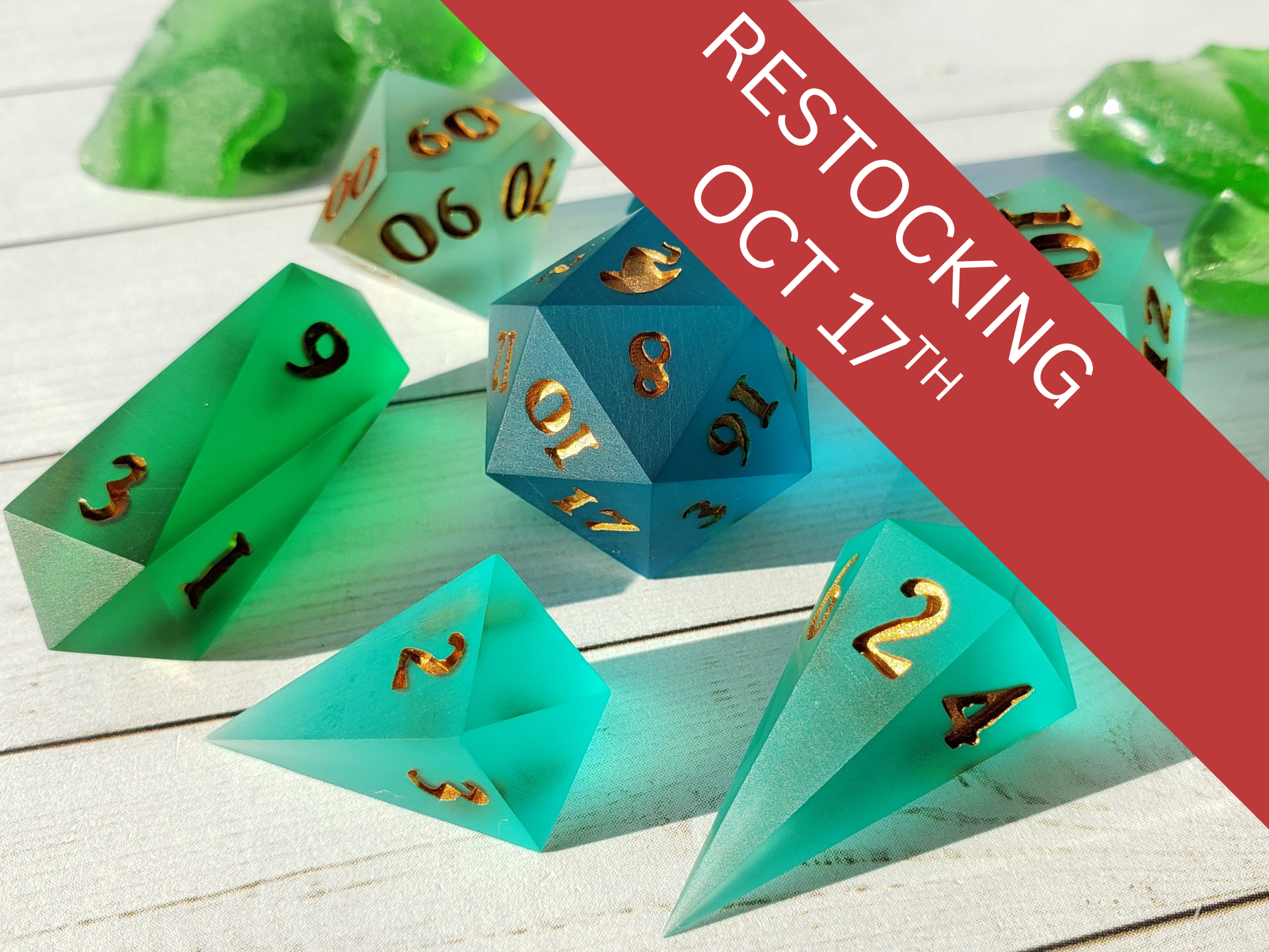 7-piece set of handmade, sharp-edged dice inspired by beach glass. A mix of bottle blues and greens with a matte finish.