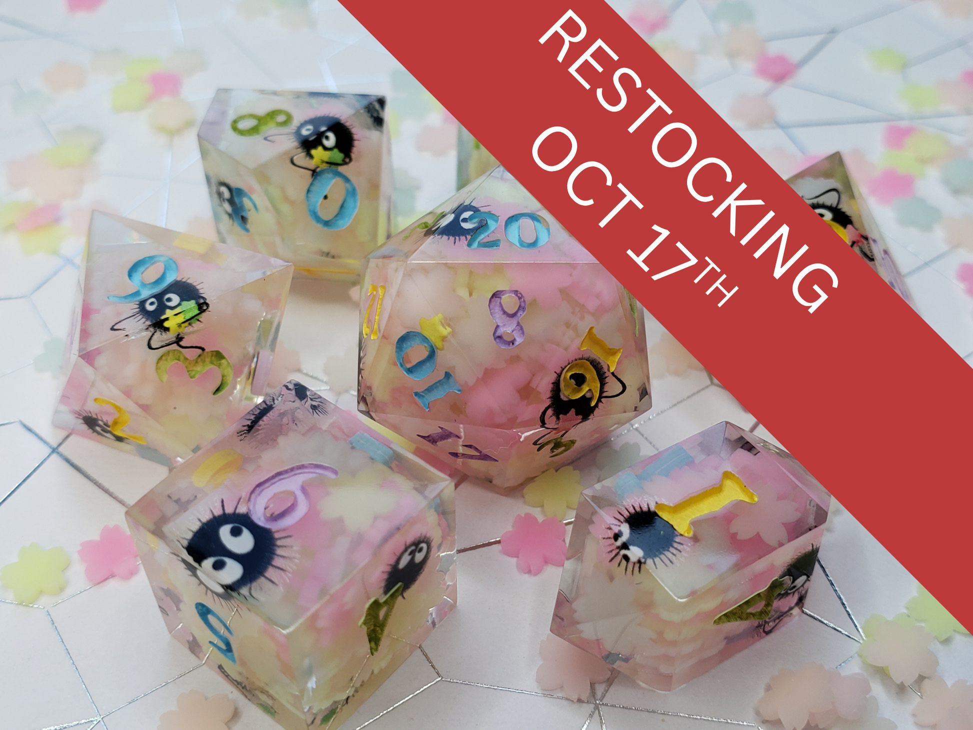 7-piece set of handmade, sharp-edged dice featuring soot sprite decals on a "konpeito" base.
